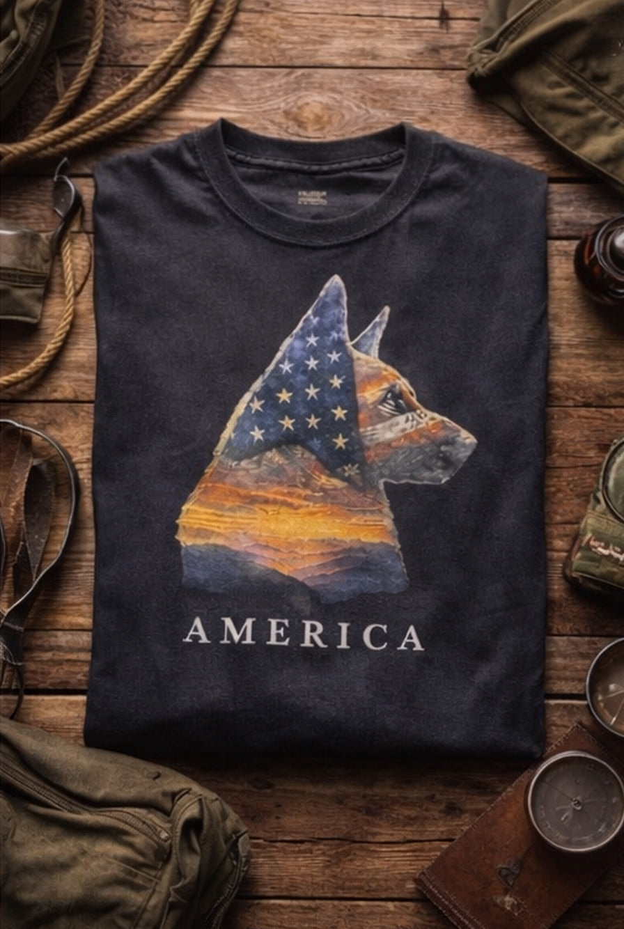 Your new favorite shirt. Built on the iconic Comfort Colors 1717 heavy weight tee, garment dyed, vintage soft, rugged, and made to last. Featuring our signature German Shepherd silhouette overlaid with the American Flag and the Shenandoah Valley sunset.